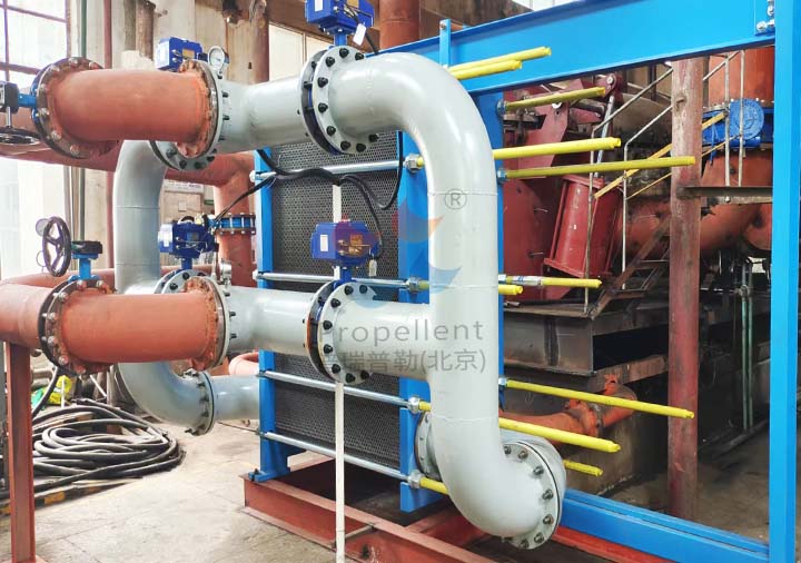 寬流道板式換熱器進(jìn)行印染廢水余熱回收,將廢水中的熱量傳遞給工藝用水,節(jié)約能源,提高生產(chǎn)效率。